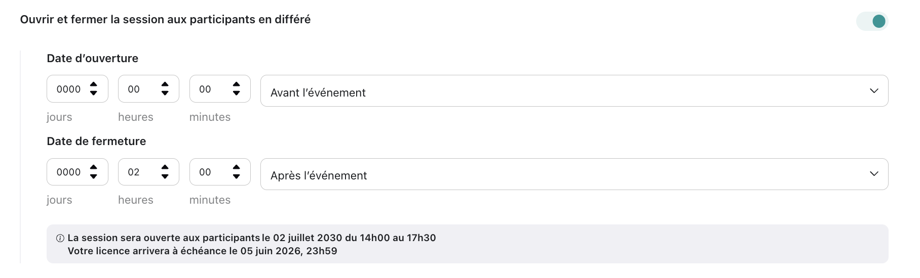 Fonctionnalité activée = Un bouton rejoindre apparaitra aux participants à l'heure définie, cela peut se faire en amont de l'événement, le flux vidéo ne sera pas visible pour eux mais ils pourront échanger dans le chat. La session sera fermée à la date indiquée, tant que la session n'est pas clôturée les participants pourront la rejoindre à n'importe quel moment par ex : pour revoir le replay, répondre au formulaire de satisfaction, etc