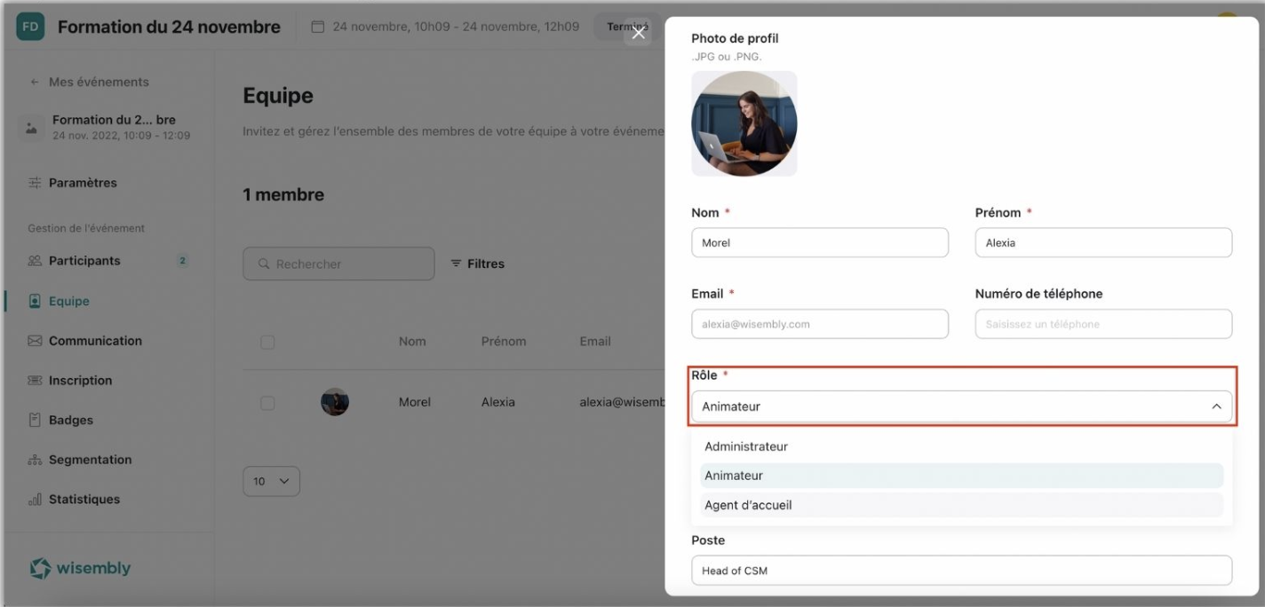 Le rôle d'agent d'accueil est disponible pour aider l'admin à scanner les badges des participants le jour de l'événement.